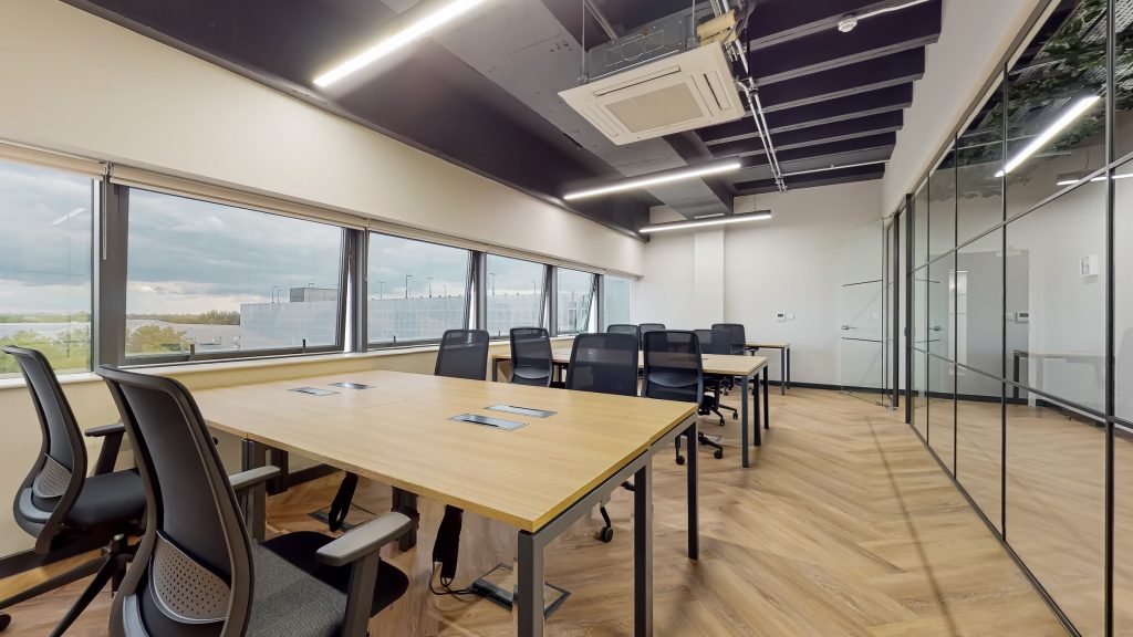 This newly added Day Office is perfect for remote teams looking to work together in the same space. Located on the 10th floor, this office space fosters a comfortable and bright room, fitting up to 10 people. The space is equipped with plenty of chairs and desk space. It has some dividers to create a collaborative workspace with individual desks. Additionally, the office features high speed WiFi, a kitchen, lounge area, private rooms, and a common room, ensuring an enjoyable and productive work environment.